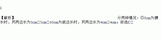 C 【解析】分两种情况:①3cm为腰长时,另两边长为3cm,5cm;②3cm为底边长时,另两边长为4cm,4cm;故选C.