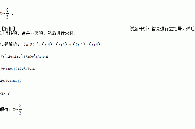 解方程:(x+2)2+(x-4)(x+4)=(2x-1)(x+4).