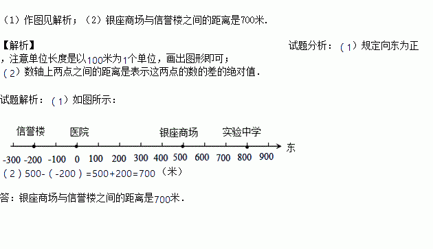 在垦利区一条东西走向的新兴路上,有信誉楼、医院、银座商场、实验中学四家公共场所.已知银座商场在医院东500米,信誉楼在医院西200米,实验中学在医院东800米.若将马路近似的看成一条直线,以医院为原点,向东方向为正方向,用1个单位长度表示100米,