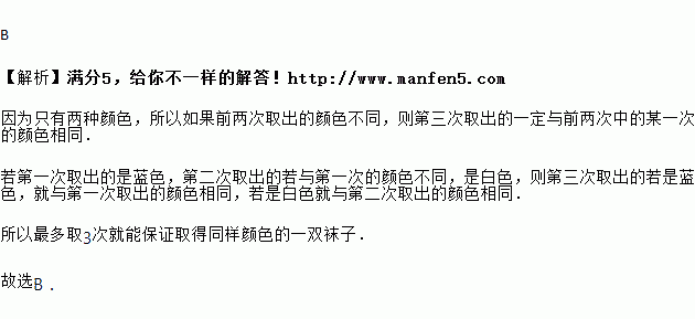 小明有四双样式相同、大小相同的袜子,其中两双为蓝色,两双为白色.这八只袜子散放在一起,小明不看而取,一次取出一只,问至多取几次就能保证取得同样颜色的一双袜子( )