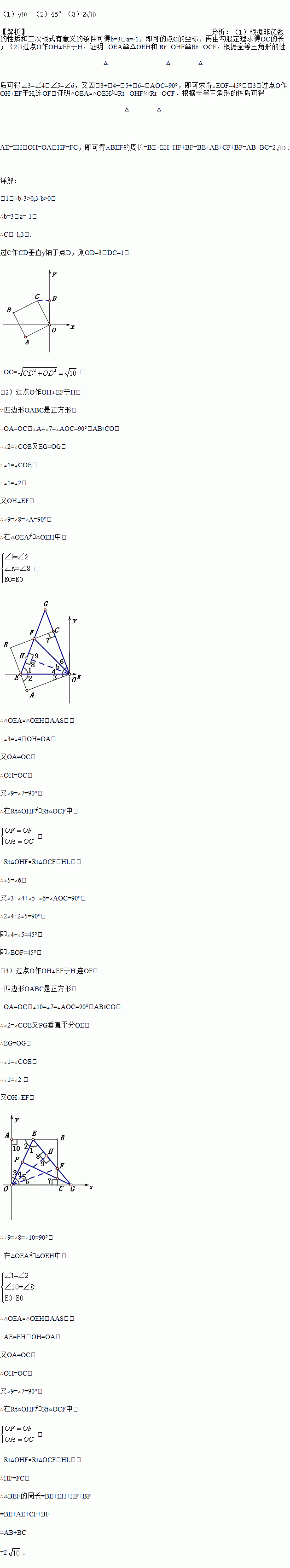 £¨3£©Èçͼ¢Û£¬½«£¨1£©ÖÐÕý·½ÐÎOABCÈÆµãO˳ʱÕëÐýת£¬Ê¹OAÂäÔÚyÖáÉÏ£¬EΪABÉÏÈÎÒâÒ»µã£¬OEµÄ´¹Ö±Æ½·ÖÏß½»xÖáÓÚµãG£¬½»OEÓÚµãP,Á¬½ÓEG½»BCÓÚµãF£¬Çó¡÷BEFµÄÖܳ¤¡£
