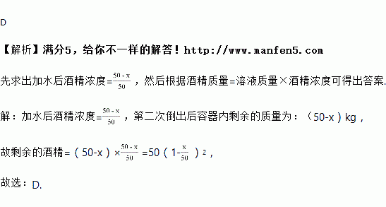 一个容器内盛满纯酒精,第一次倒出若干千克纯酒精后加入同千克的水;第二次又倒出相同千克的酒精溶液,这时容器内酒精溶液含纯酒精![]()