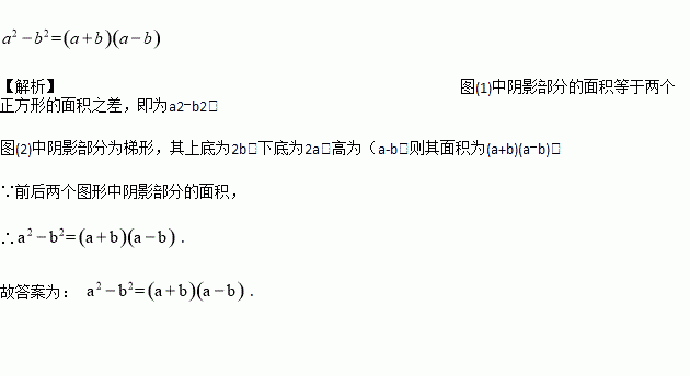 如图1,将边长为a的大正方形剪去一个边长为b的小正方形(ab),将剩下的阴影部分沿图中的虚线剪开,拼接后得到图2,这种变化可以用含字母a,b的等式表示为_________________.