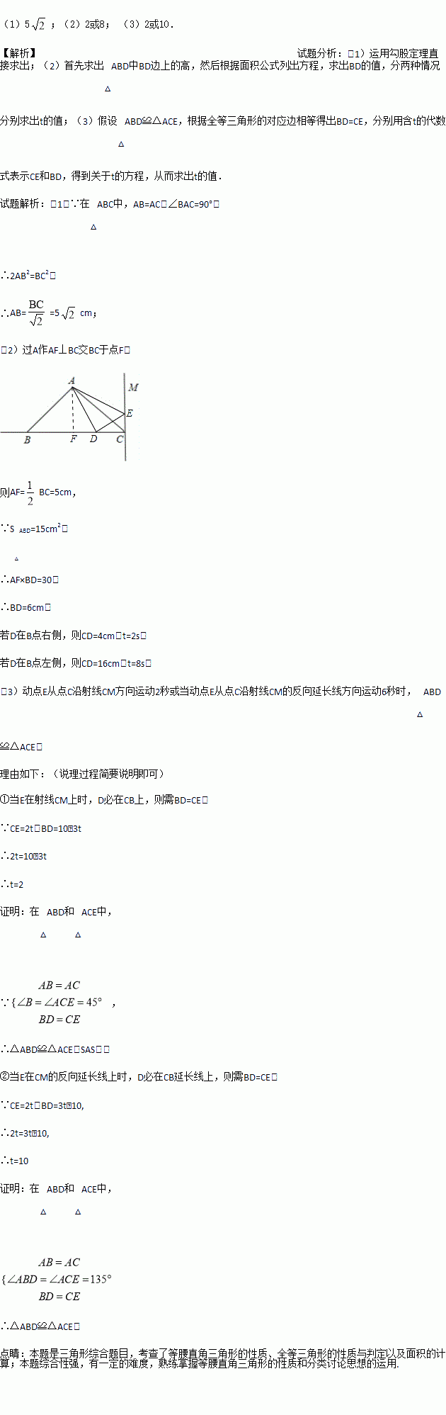 如图,在△ABC中,已知AB=AC,∠BAC=90°,BC=10cm,直线CM⊥BC,动点D从点C开始沿射线CB方向以每秒3厘米的速度运动,动点E也同时从点C开始在直线CM上以每秒2厘米的速度运动,连接AD、AE,设运动时间为t秒.
