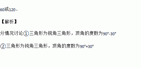 若等腰三角形一腰上的高与另一腰上的夹角为30°,则顶角的度数为 度.
