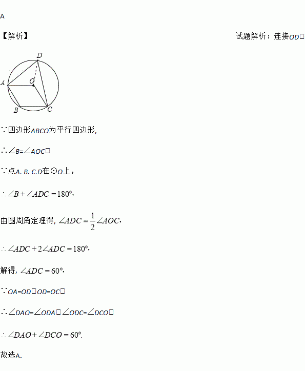 如图,已知点A、B、C、D在⊙O上,圆心O在∠D内部,四边形ABCO为平行四边形,则∠DAO与∠DCO的度数和是( )
