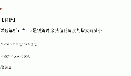 A. 0°<∠A<60° B. 60°≤∠A<90° C. 0°<∠A≤30° D. 30°≤∠A<90°