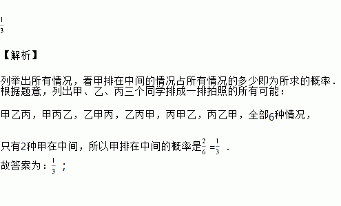 甲、乙、丙3名学生随机排成一排拍照,其中甲排在中间的概率是_____.