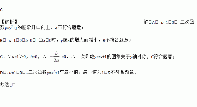 C 【解析】解:A.∵a=1>0,∴二次函数y=x2+1的图象开口向上,A不符合题意; B.∵a=1>0,b=0,∴当x<0时,y随x的增大而减小,B不符合题意; C.∵a=1>0,b=0,∴ =0,∴二次函数y=x2+1的图象关于y轴对称,C符合题意; D.∵a=1>0,∴二次函数y=x2+1有最小值,最小值为1,D不符合题意. 故选C.