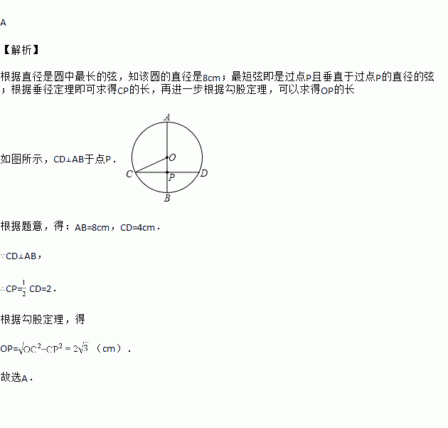 在⊙O中,P为其内一点,过点P的最长弦的长为8cm,最短的弦的长为4cm,则OP的长为( )