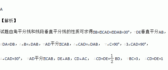 如图,在Rt△ABC中,∠C=90°,∠CAB的平分线交BC于D,DE是AB的垂直平分线,垂足为E.若BC=3,则DE的长为( )
