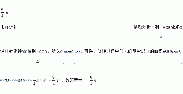 如图,在4×4的正方形网格中,每个小正方形的边长均为1,将△AOB绕点O逆时针旋转90°得到△COD,则旋转过程中形成的阴影部分的面积为________。