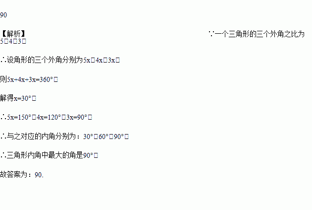 一个三角形的三个外角之比为5:4:3,则这个三角形内角中最大的角是__________度.