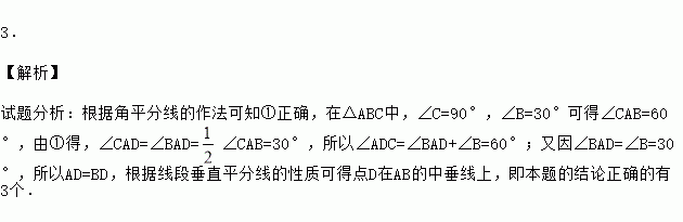 如图,在△ABC中,∠C=90°,∠B=30°,以A为圆心,任意长为半径画弧分别交AB、AC于点M和N,再分别以M、N为圆心,大于MN的长为半径画弧,两弧交于点P,连结AP并延长交BC于点D,则下列说法①AD是∠BAC的平分线;②∠ADC=60°③点D在AB的中垂线上;正确的个数是 个.