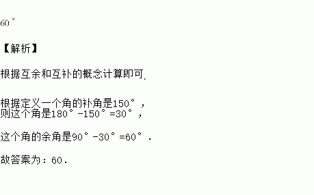 如果一个角的补角是150°,那么这个角的余角的度数是_____度.