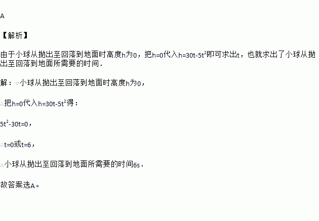 如图,从地面竖直向上抛出一个小球,小球的高度单位:m 与小球运动时间单位:之间的函数关系式为,那么小球从抛出至回落到地面所需的时间是