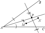 解:作∠BAC的平分线和MN的垂直平分线,其交点即为所求点P.