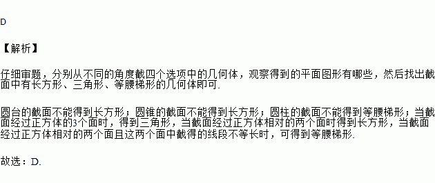 用平面去截下列几何体,能截得长方形、三角形、等腰梯形三种形状的截面,这