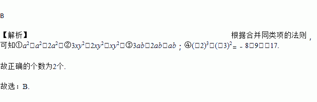 B 【解析】根据合并同类项的法则,可知①a2+a2=2a2,②3xy2-2xy2=xy2;③3ab-2ab=ab;④(-2)3-(-3)2=-8-9=-17. 故正确的个数为2个. 故选:B.