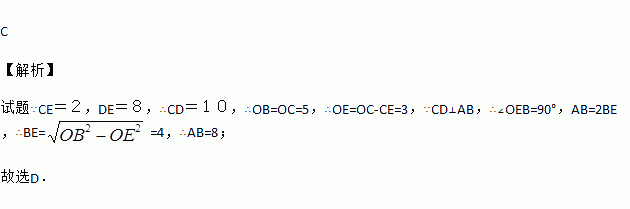 如图,⊙O的直径CD垂直弦AB于点E,且CE=2,DE=8,则AB的长为( )