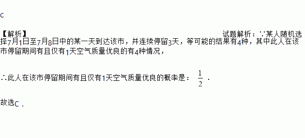 如图是某市7月1日至10日的空气质量指数趋势图,空气质量指数小于100表示空气质量优良,空气质量指数大于200表示空气重度污染.某人随机选择7月1日至8日中的某一天到达该市,并连续停留3天,则此人在该市停留期间有且仅有1天空气质量优良的概率是( )