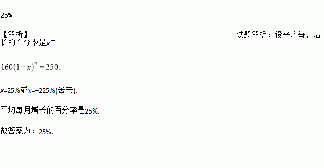 某公司4月份的利润为160万元,要使6月份的利润达到250万元,则平均每月增长的百分率是_____.