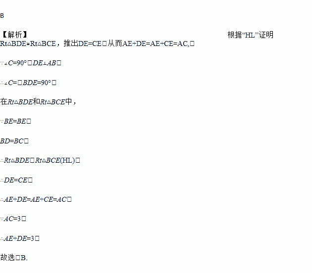 如图,在△ABC中,∠C=90°,DE⊥AB于D,BC=BD,已知AC=3㎝,那么AE+DE等于( )