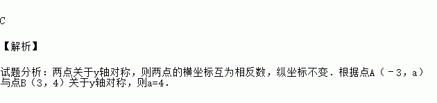 C 【解析】 试题分析:两点关于y轴对称,则两点的横坐标互为相反数,纵坐标不变.根据点A(﹣3,a)与点B(3,4)关于y轴对称,则a=4.