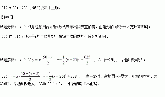 ,现要求在图中所示位置留2m的门,且仍使饲养室占地面积最大.小敏说:“只要饲养室长比(1)中的长多2m就行了.”请你通过计算,判断小敏的说法是否正确.