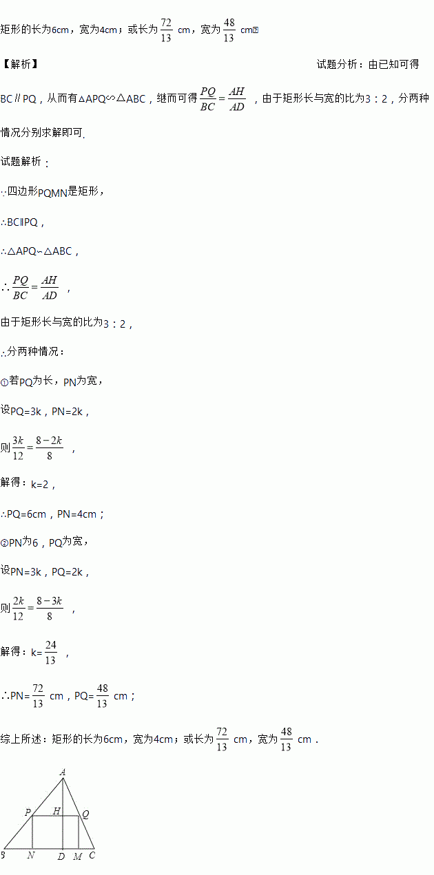 一块材料的形状是锐角三角形ABC,边BC=12cm,高AD=8cm,把它加工成矩形零件如图,要使矩形的一边在BC上,其余两个顶点分别在AB,AC上.且矩形的长与宽的比为3:2,求这个矩形零件的边长.