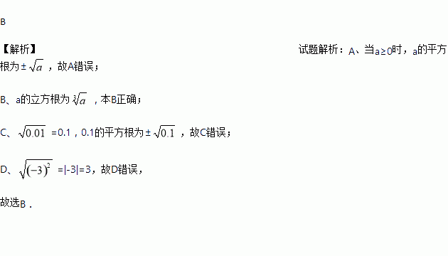 A. a的平方根是± B. a的立方根是 C. 的平方根是0.1 D. =-3
