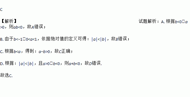 C 【解析】试题解析:A. 根据b<0,a>0,则ab<0,故A错误; B. 由于b1,00,故C正确; D. 根据:|a|<|b|,且a>0,b<0,则a+b<0,故D错误. 故选C.