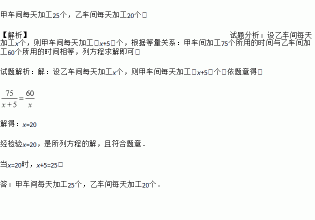 甲车间每天加工25个,乙车间每天加工20个. 【解析】试题分析:设乙车间每天加工x个,则甲车间每天加工(x+5)个,根据等量关系:甲车间加工75个所用的时间与乙车间加工60个所用的时间相等,列方程求解即可. 试题解析:【解析】 设乙车间每天加工x个,则甲车间每天加工(x+5)个,依题意得: 解得:x=20 经检验x=20,是所列方程的解,且符合题意. 当x=20时,...