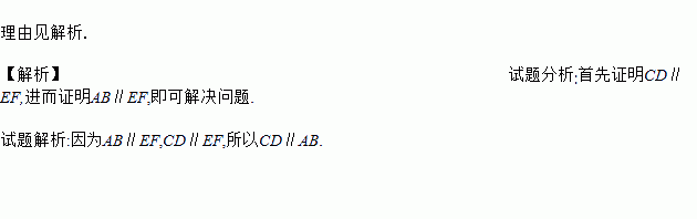 如图所示,取一张长方形的硬纸板ABCD,将硬纸板ABCD对折使CD与AB重合,EF为折痕.把长方形ABFE平放在桌面上,另一个面CDEF无论怎么改变位置总有CD∥AB存在,你知道为什么吗?