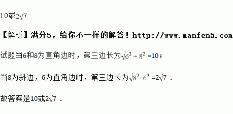 直角三角形的两边长分别是6,8,则第三边的长为_____________.