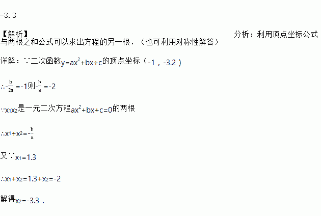 的顶点坐标(-1,-3.2)及部分图象(如图所示),由图象可知关于x的一元二次方程的两个根分别是x1=1.3和x2=__.