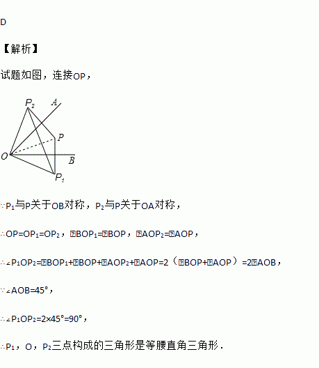 已知∠AOB=45°,点P在∠AOB内部,P1与P关于OB对称,P2与P关于OA对称,则P1,O,P2三点构成的三角形是( )