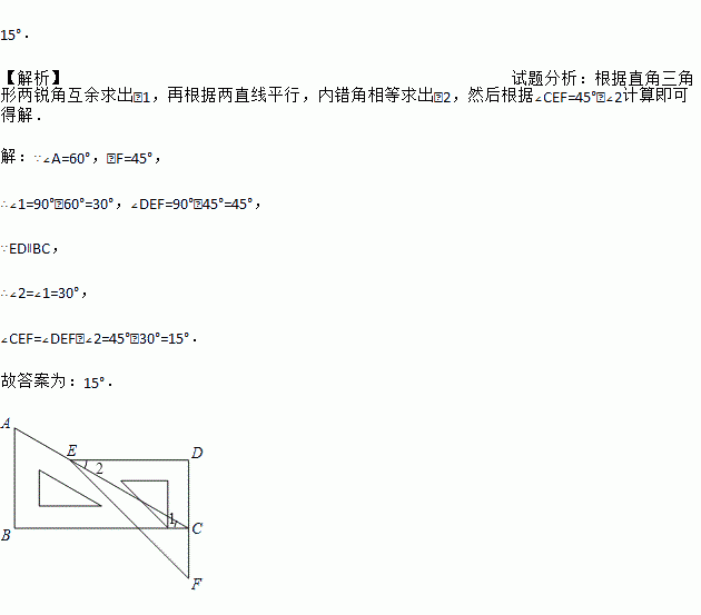 将一副直角三角板ABC和DEF如图放置(其中∠A=60°,∠F=45°),使点E落在AC边上,且ED∥BC,则∠CEF的度数为 .