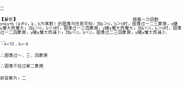 直线y=10x-6一定不经过第_____象限(“一”、“二”、“三”或“四”)。