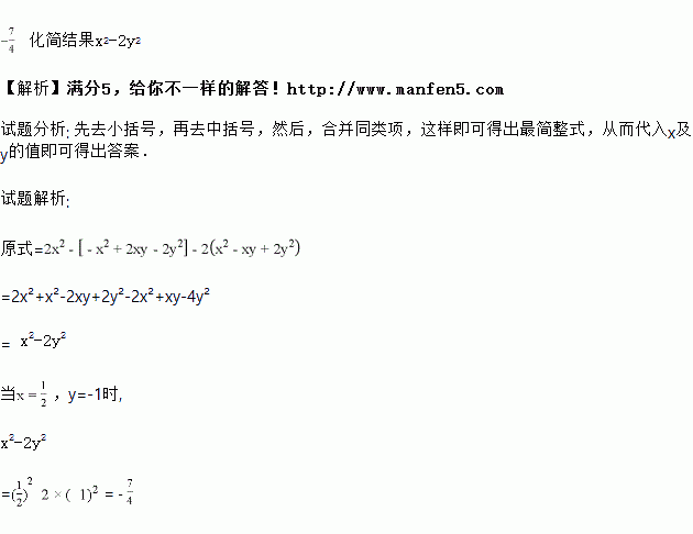 先化简,再求值:2x2–[3(–x2+xy)–2y2]–2(x2–xy+2y2),其中x =,y =–1.