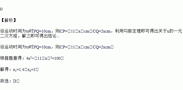 如图所示,在Rt△ABC中,∠C=90°,AC=11cm,点P从点A出发沿AC以1cm/s的速度移动,点Q从点C出发沿CB以2cm/s的速度移动,如果P,Q分别从A,C两点同时出发,当它们相距10cm时所需的时间为( )
