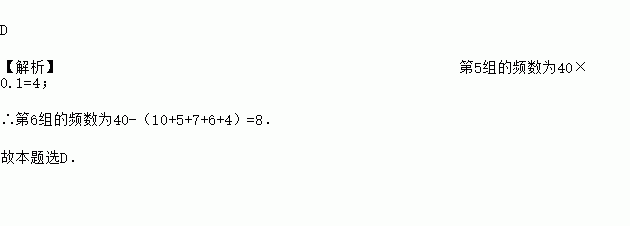 数据共40个,分为6组,第1到第四组的频数分别为10,5,7,6,第5组的频率为0.1,则第6组的频数为 ( )