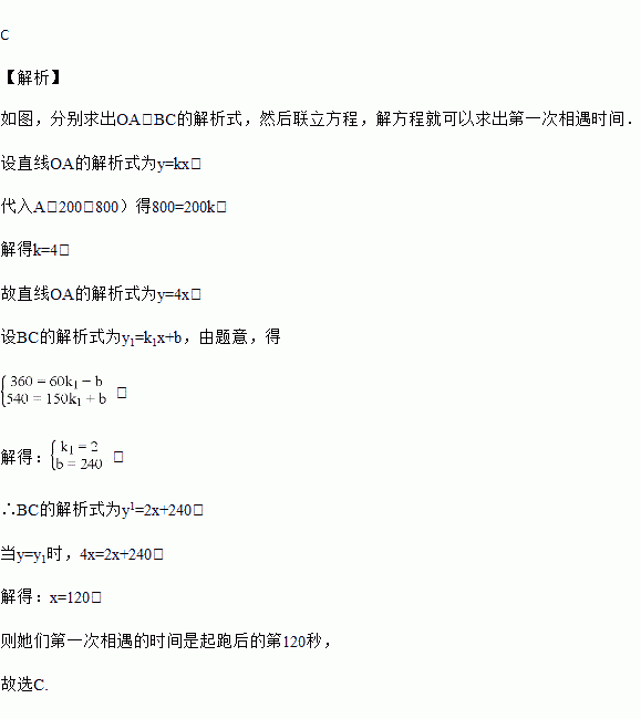 为增强学生体质,某中学在体育课中加强了学生的长跑训练.在一次女子800米耐力测试中,小静和小茜在校园内200米的环形跑道上同时起跑,同时到达终点;所跑的路程S(米)与所用的时间t(秒)之间的函数图象如图所示,则她们第一次相遇的时间是起跑后的第( )秒