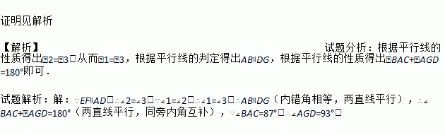 如图,EF∥AD,∠1=∠2,∠BAC=87°,求你∠AGD的度数.