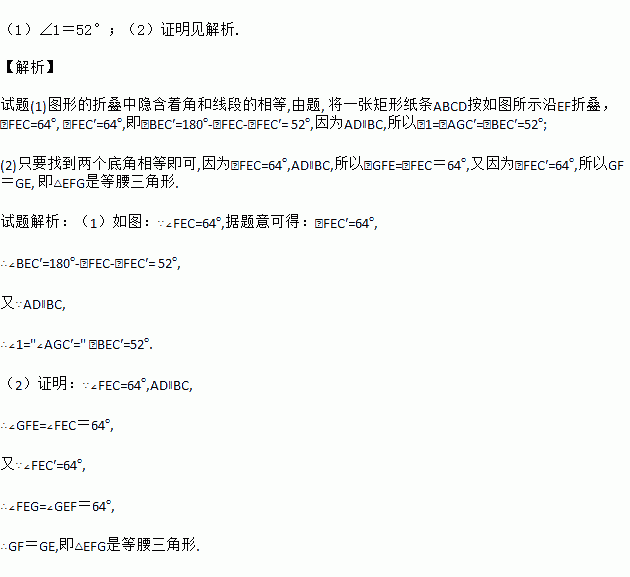 (8分)将一张长方形纸条ABCD按如图所示折叠,若折叠角∠FEC=64°.