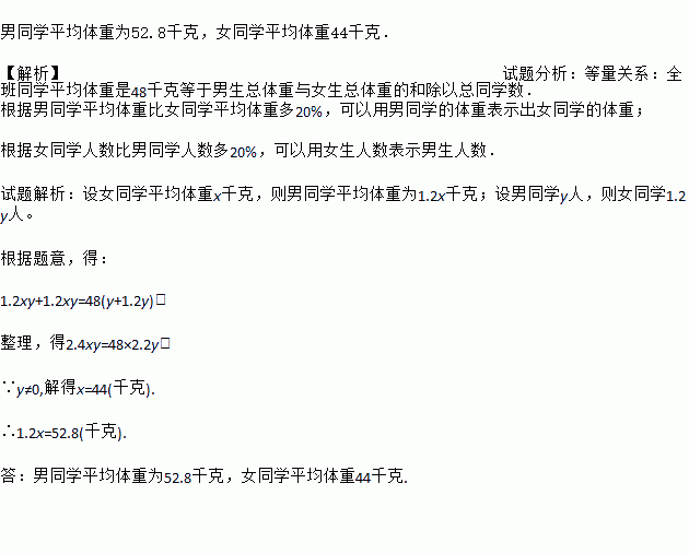 高一某班在入学体检中测得全班同学的平均体重是48kg,其中男同学的平均体重比女同学的平均体重多20%,而女同学人数比男同学人数多20%.男、女同学平均体重各是多少?