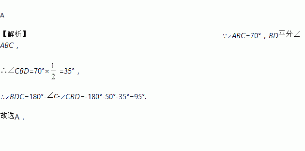 如图,已知在△ABC中,∠ABC=70°,∠C=50°,BD是角平分线,则∠BDC的度数为