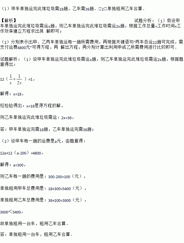 (1)甲车单独运完此堆垃圾需18趟,乙车需36趟.(2)单独租用乙车合算. 【解析】试题分析:(1)假设甲车单独运完此堆垃圾需运x趟,则乙车单独运完此堆垃圾需运2x趟,根据工作总量=工作时间×工作效率建立方程求出其 解即可; (2)分别表示出甲、乙两车单独运每一趟所需费用,再根据关键语句“两车各运12趟可完成,需支付运费4800元”可得方程,再 解出方程,再分别计算出利用甲或乙所需费用...