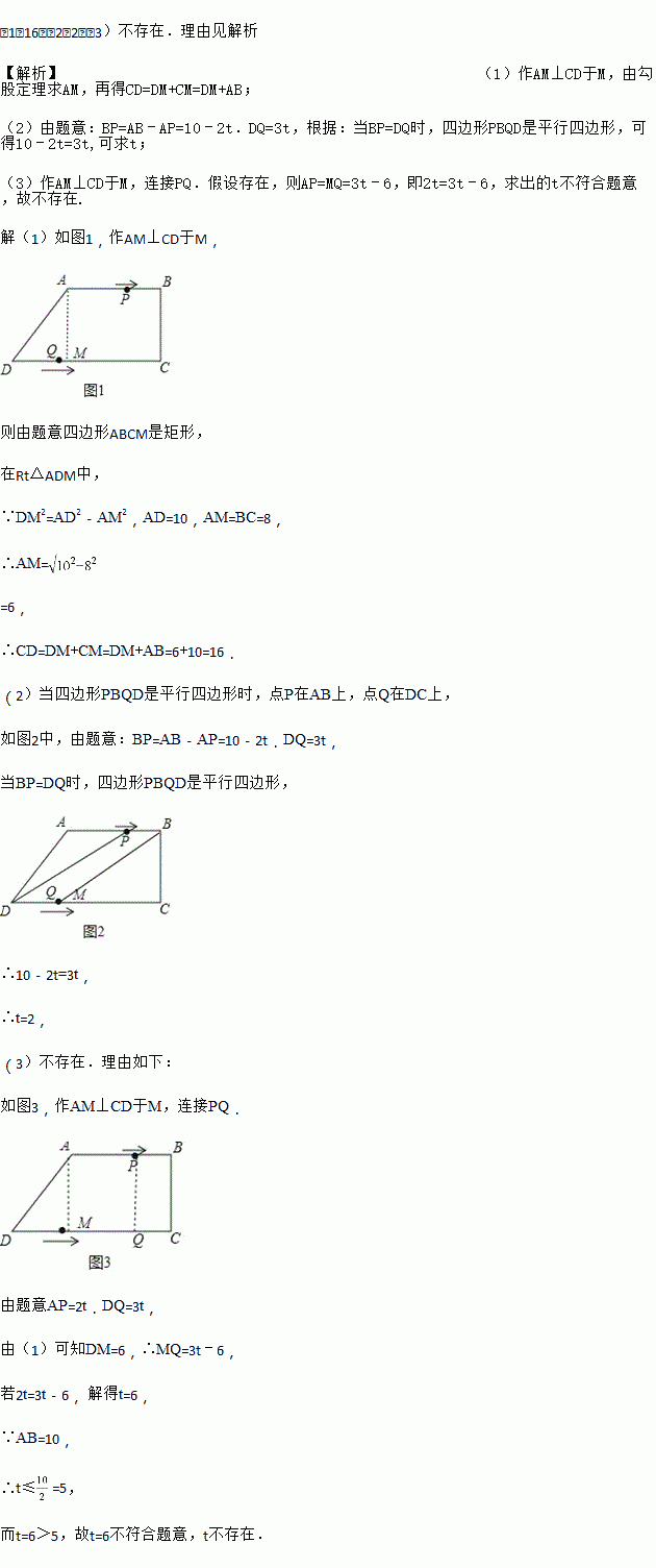Èçͼ£¬ÔÚËıßÐÎABCDÖУ¬AB¡ÎCD£¬¡ÏBCD=90¡ã£¬AB=AD=10cm£¬BC=8cm£¬µãP´ÓµãA³ö·¢£¬ÒÔÿÃë2cmµÄËÙ¶ÈÑØÏß¶ÎABÏòµãB·½ÏòÔ˶¯£¬µãQ´ÓµãD³ö·¢£¬ÒÔÿÃë3cmµÄËÙ¶ÈÑØÏß¶ÎDCÏòµãCÔ˶¯£¬ÒÑÖª¶¯µãP¡¢Qͬʱ³ö·¢£¬µãPµ½´ïBµã»òµãQµ½´ïCµãʱ£¬P¡¢QÔ˶¯Í£Ö¹£¬ÉèÔ˶¯Ê±¼äΪt (Ãë)£®