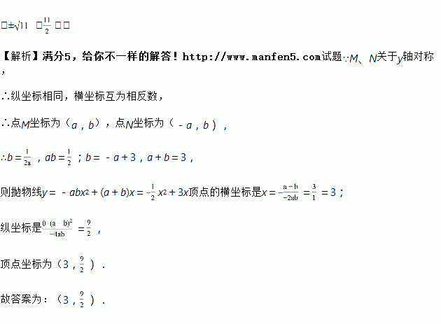 已知M、N两点关于y轴对称,且点M在双曲线上,点N在直线y=﹣x+3上,设点M坐标为(a,b),则y=﹣abx2+(a+b)x的顶点坐标为 .
